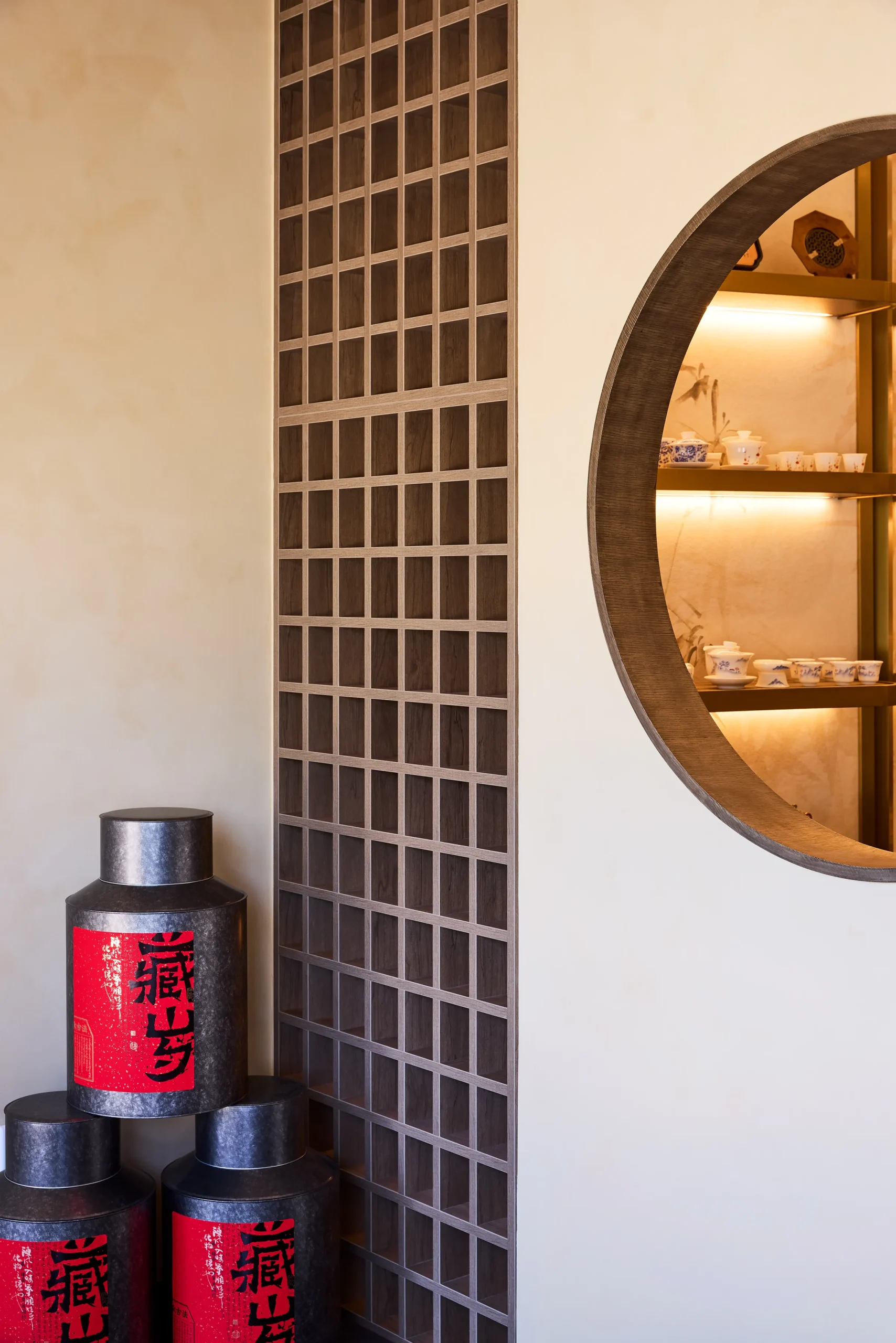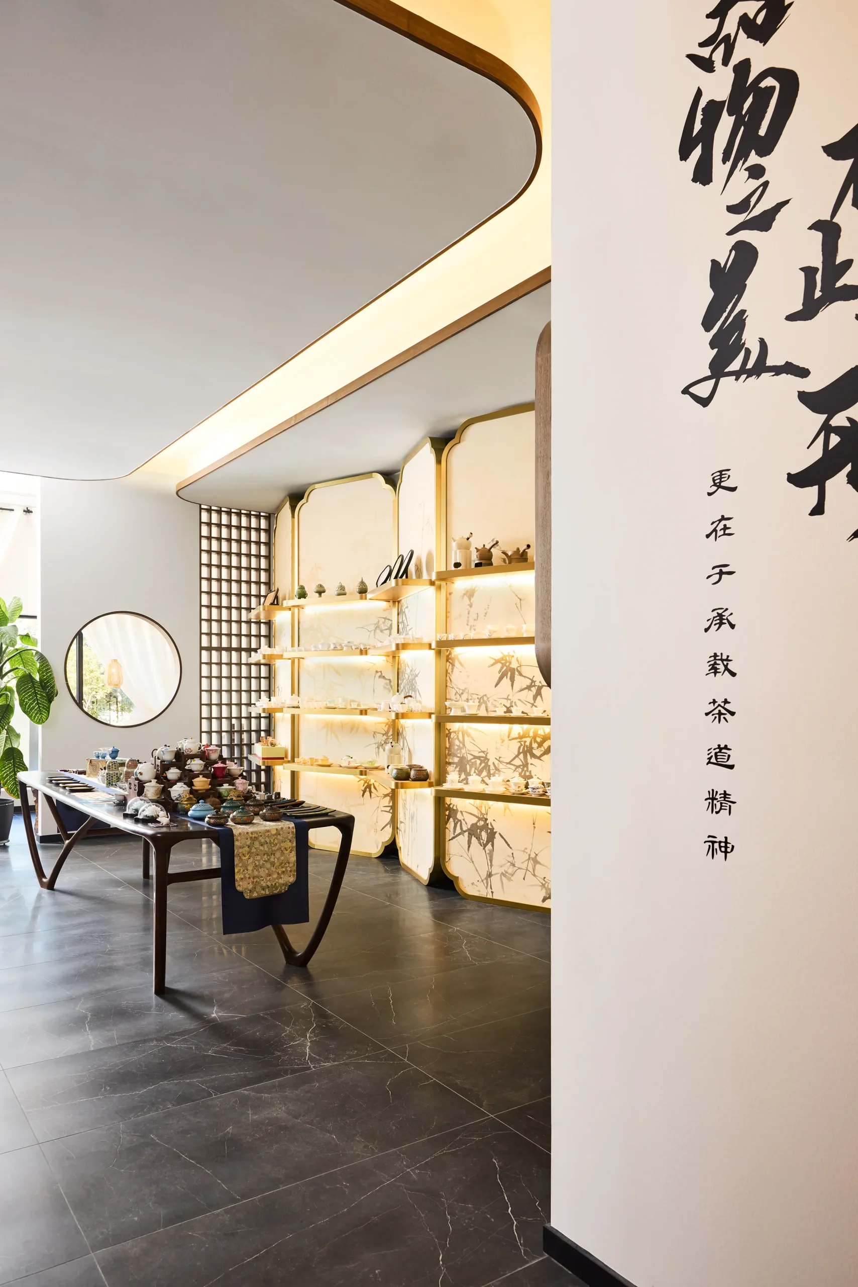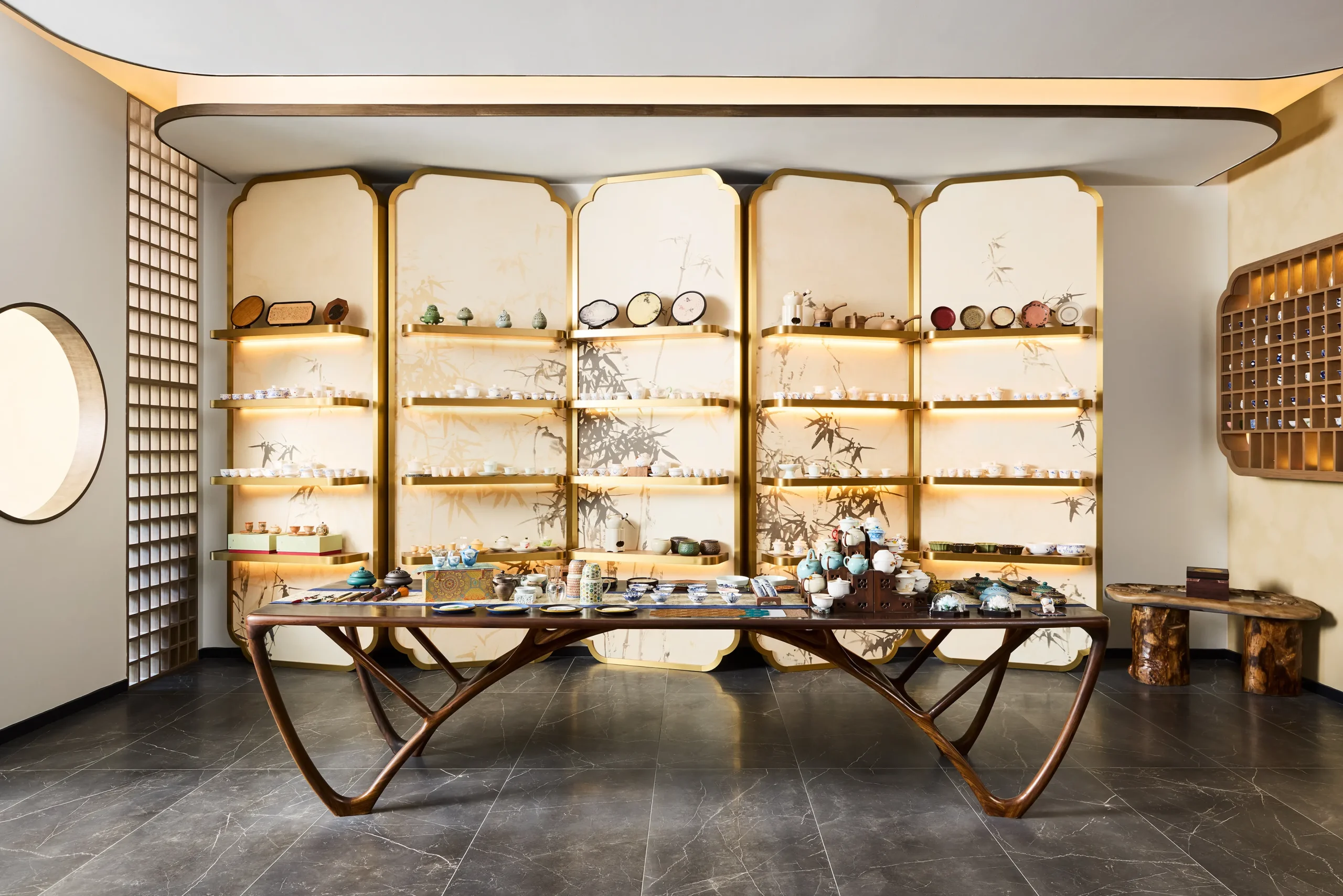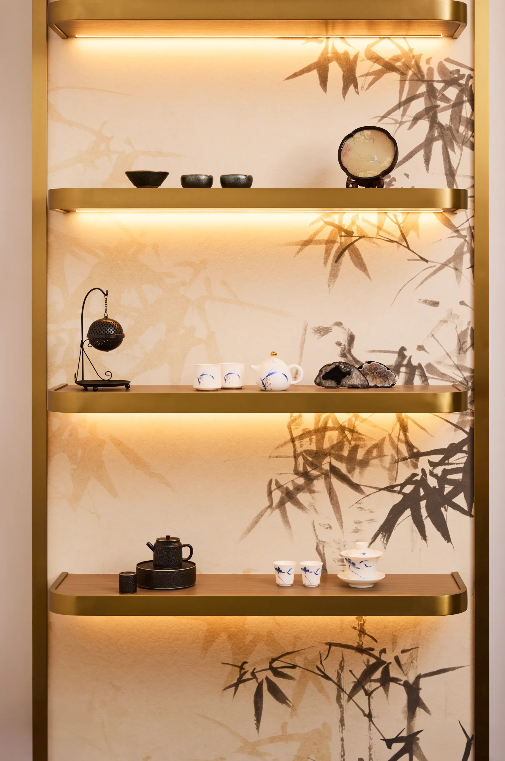 Like the perfect cup of tea, this tea shop invites a moment to pause and breathe. Its design melds the Old-World elegance of Eastern tea culture with contemporary living. Ink-wash bamboo wallpaper and softly-lit metallic gold accents quietly capture attention; no detail is overlooked – even display screens are shaped in the form tea trays.