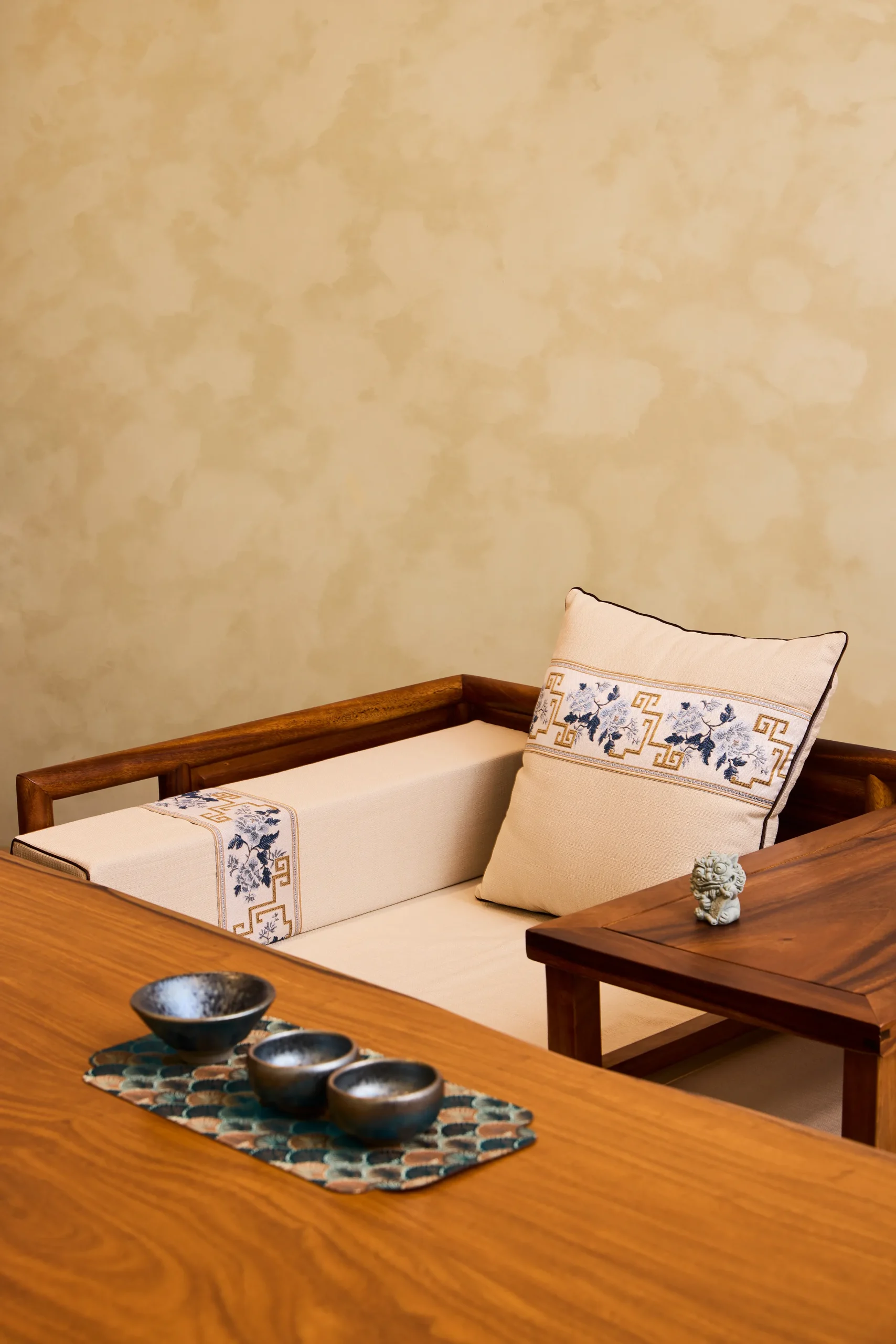 At the corner, simple brush-written Chinese calligraphy adds a touch of Eastern cultural elegance, enriching the space with poetic charm and quiet sophistication.