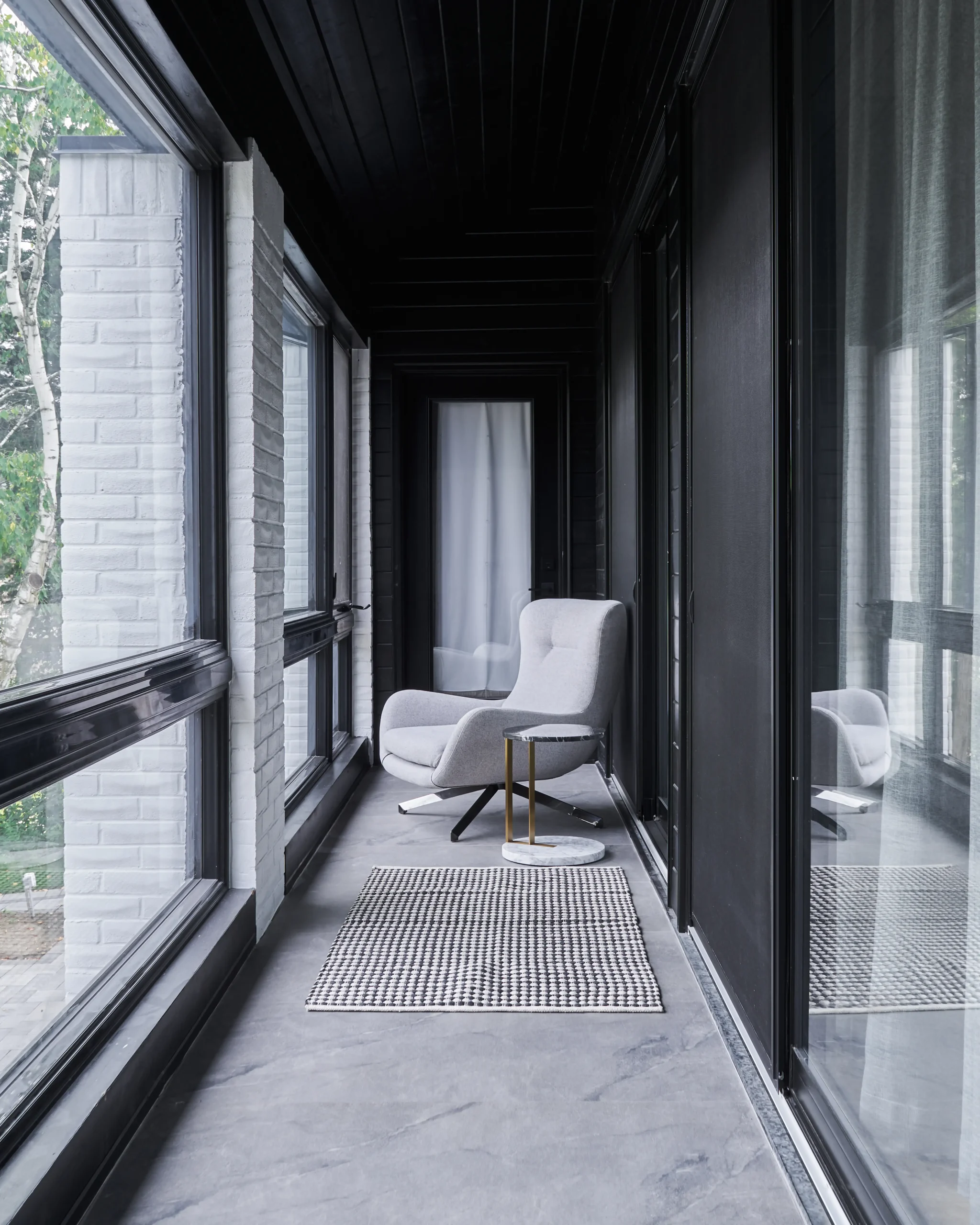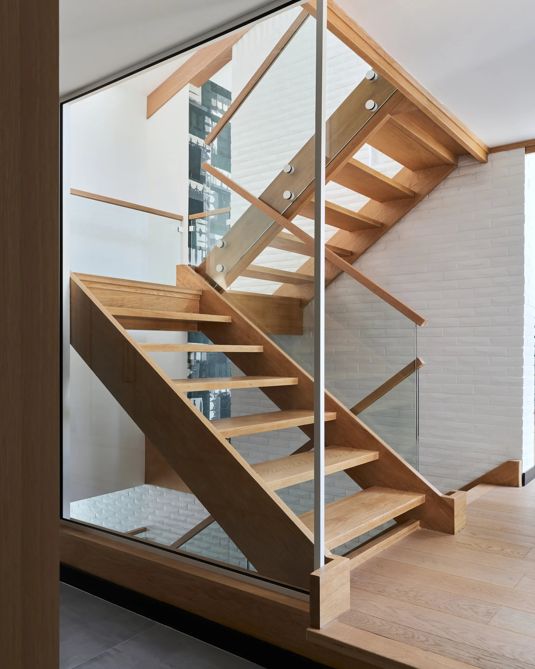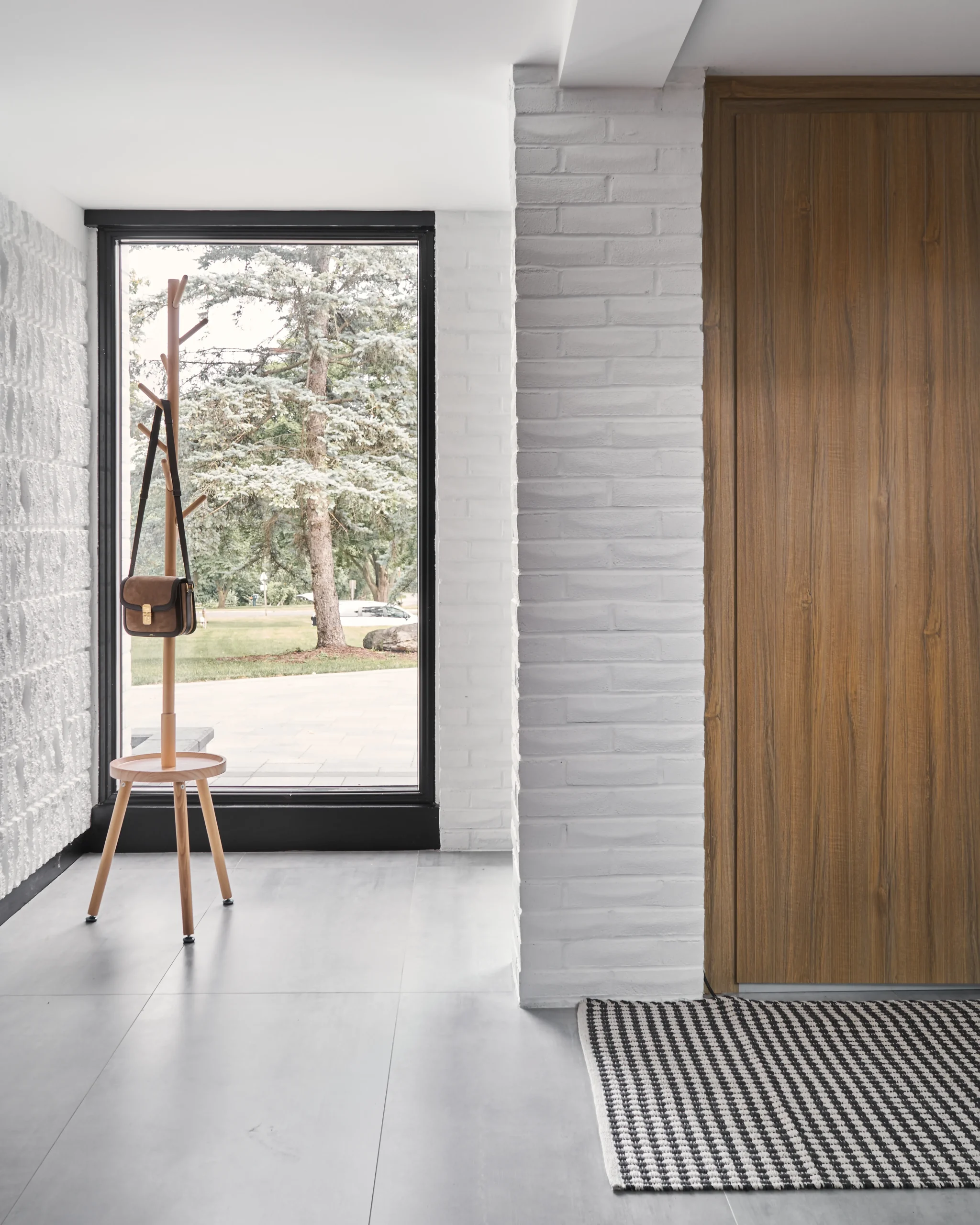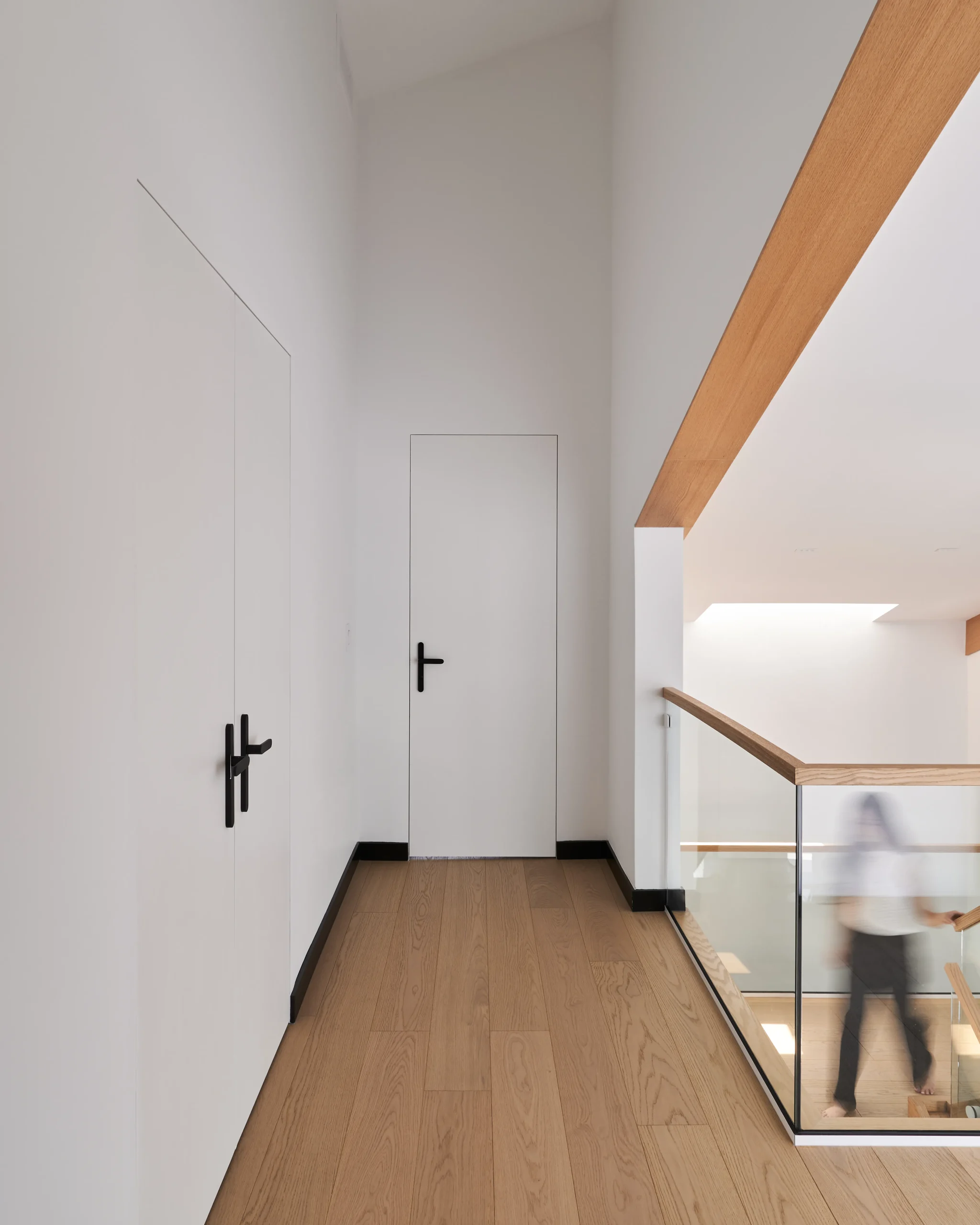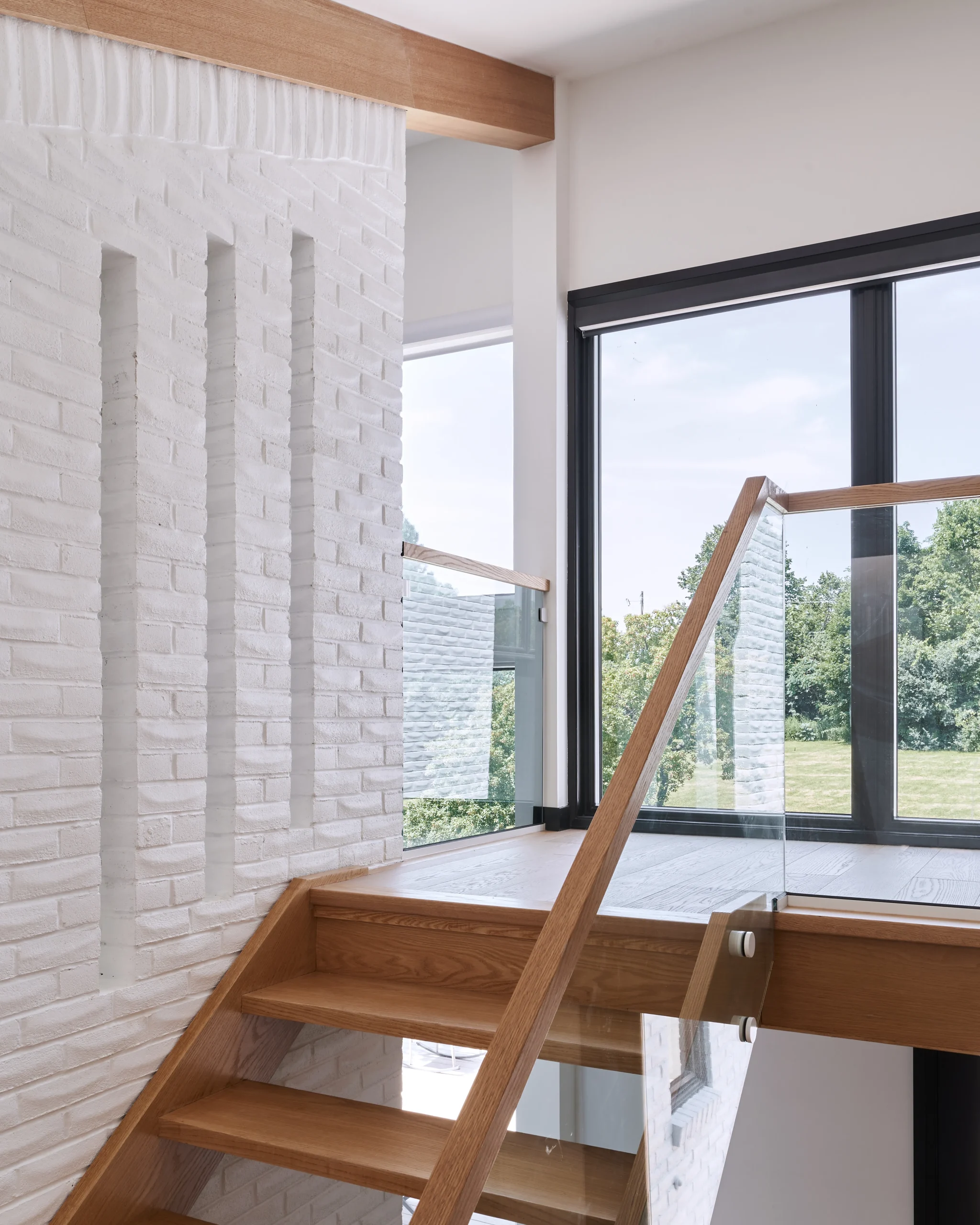 Preserving existing elements was key. The triangular roof structure remained intact, along with the exterior brick walls which extend to the interior. A restrained palette of soothing shades enriched the contemporary countenance of the space. Painting an interior double-height brick wall white factors in a crisp freshness, while adding decorative wooden beams to the ceiling layers in more visual interest and warmth.