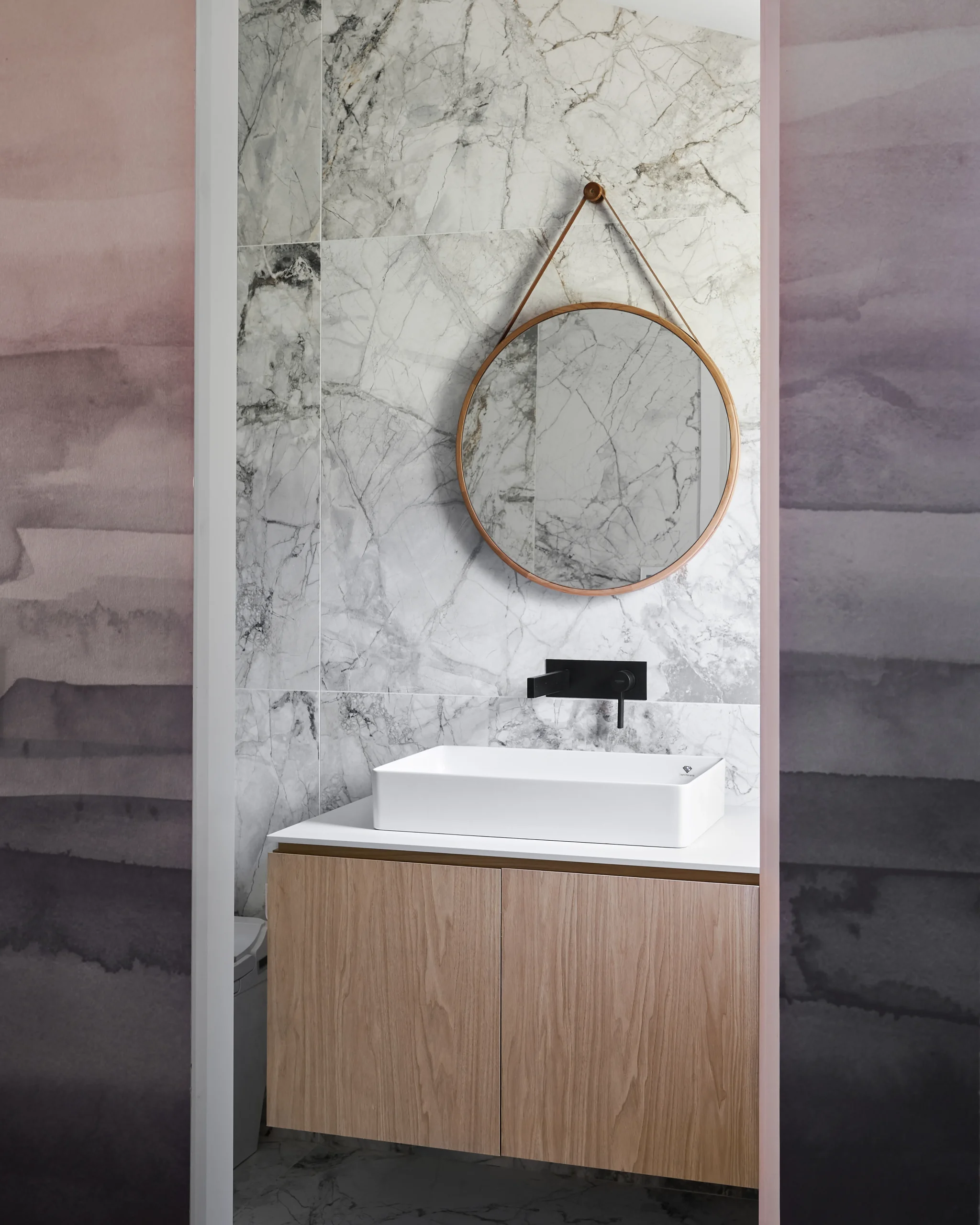 Pops of black punctuate the soothing white and grey tones throughout and look especially animated in the custom handles on concealed white doors. Wallpaper, a bold choice in a contemporary abode, makes the dining area and piano space come alive with abstract pattern and personality.