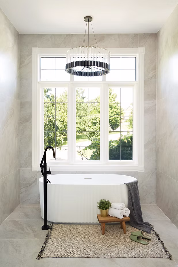A windowed niche for the tub creates an intimate retreat within the ensuite. The homeowners envisioned a classic, timeless space reminiscent of a spa getaway.