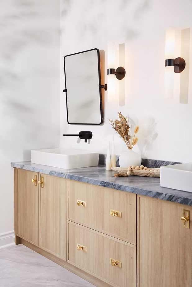 A refined, tailored look for the vanity highlights the beautiful wood finish, resembling custom furniture. Brass hardware in a unique finish warms the palette.