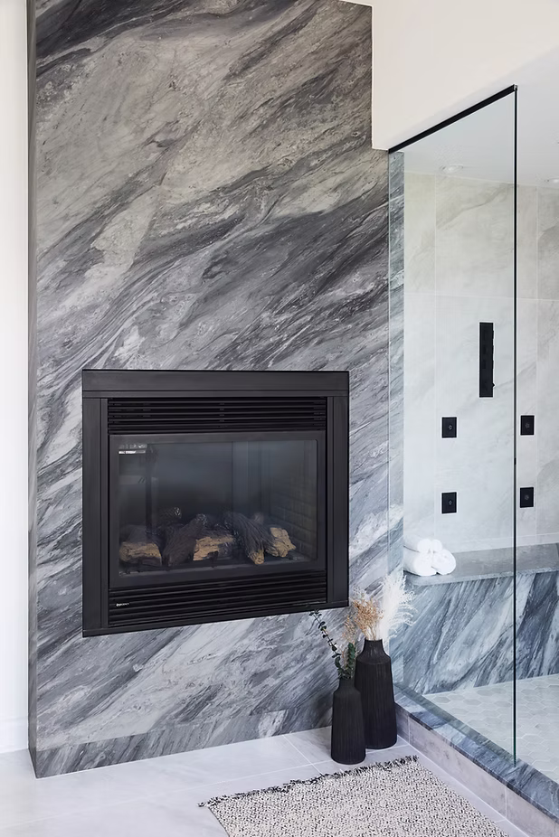The fireplace, clad in floor-to-ceiling marble, embodies the luxurious theme of this principal bathroom.
