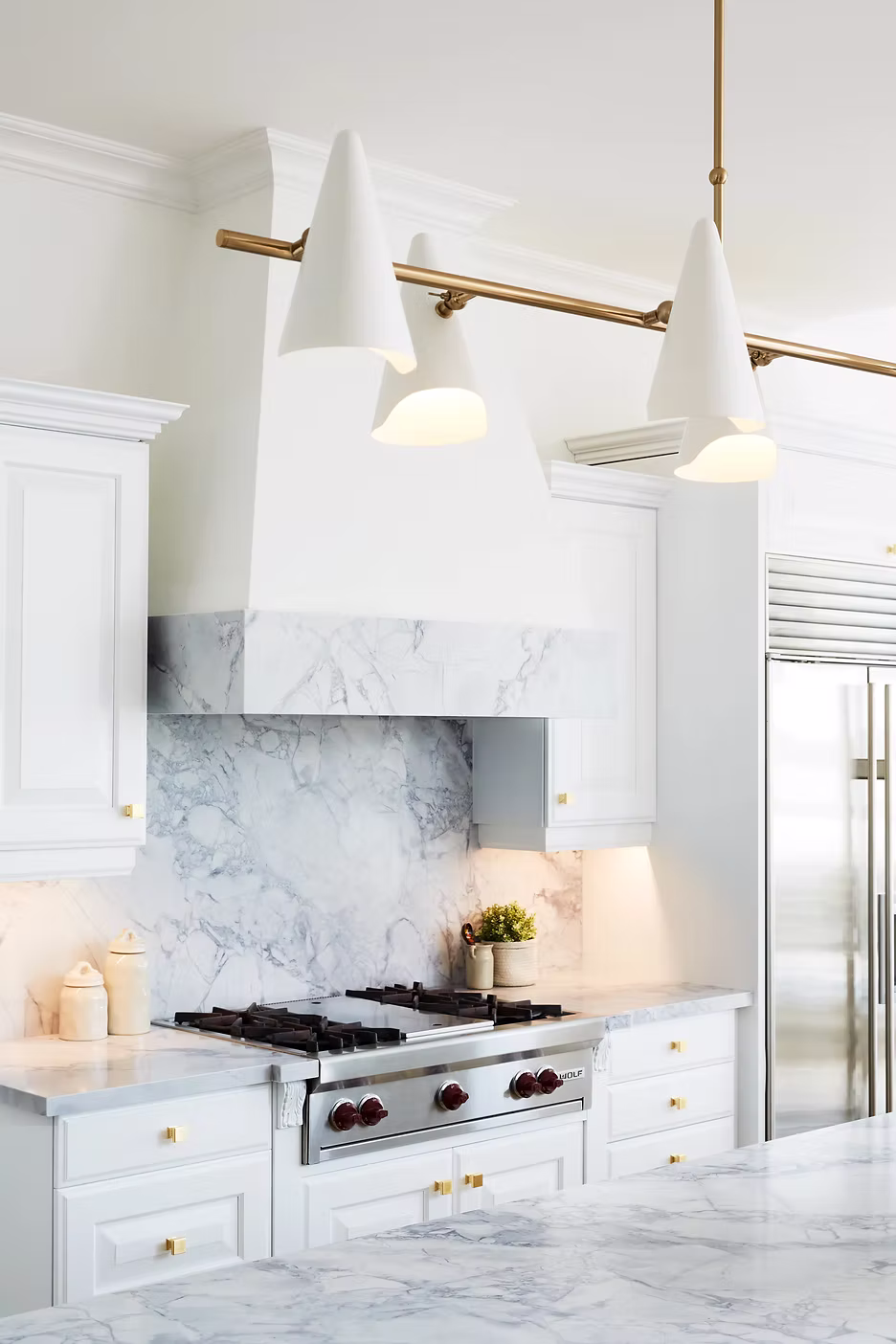 Subtle variations in color and texture bring vitality and interest to a classic white kitchen. While white kitchens are timeless, they can sometimes feel cold or unexciting. This kitchen, however, is anything but dull. By layering different colors, textures, and a mix of metals, the designer opted for white perimeter cabinetry and a grey island to create balance with the striking stone feature in this open-plan space.