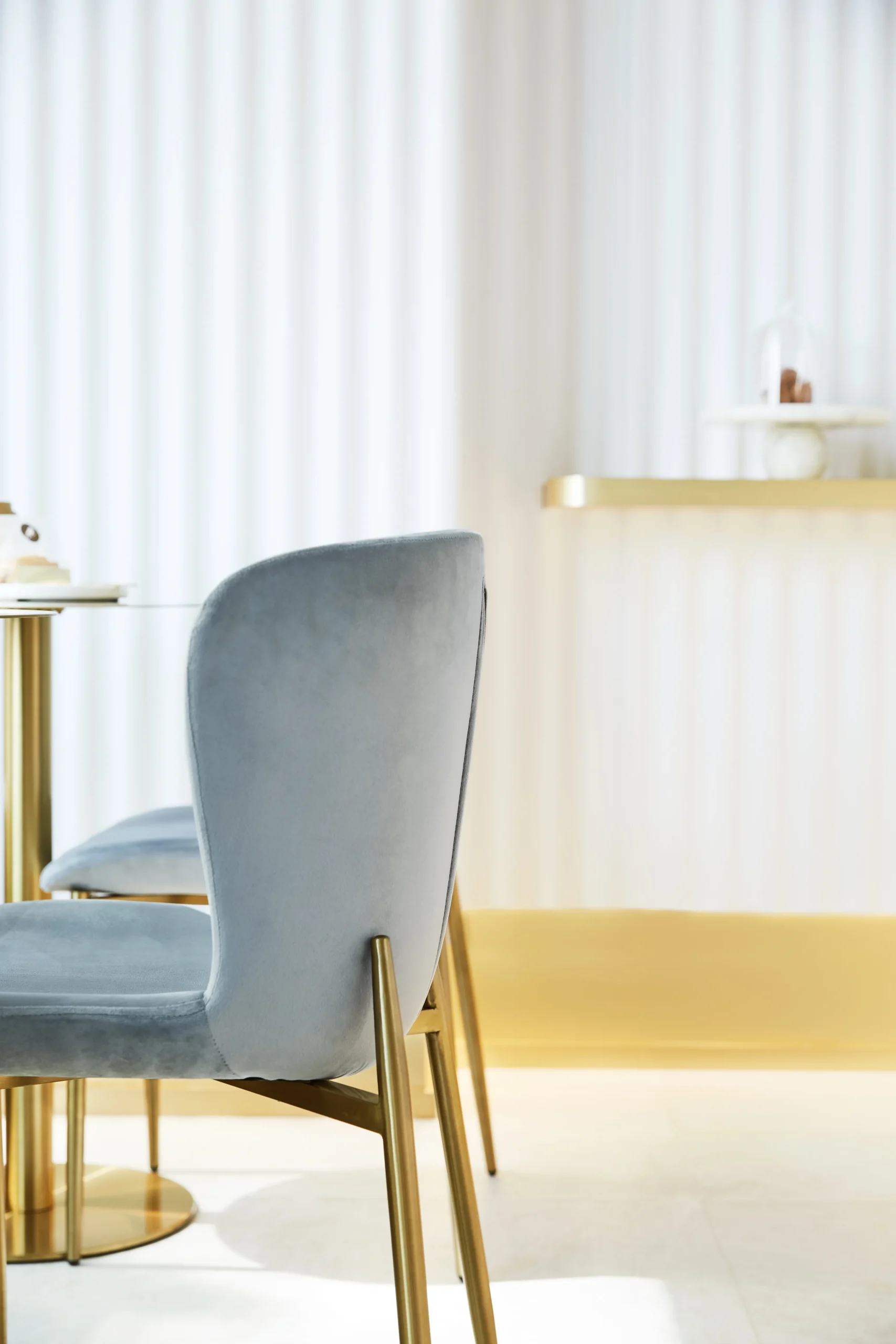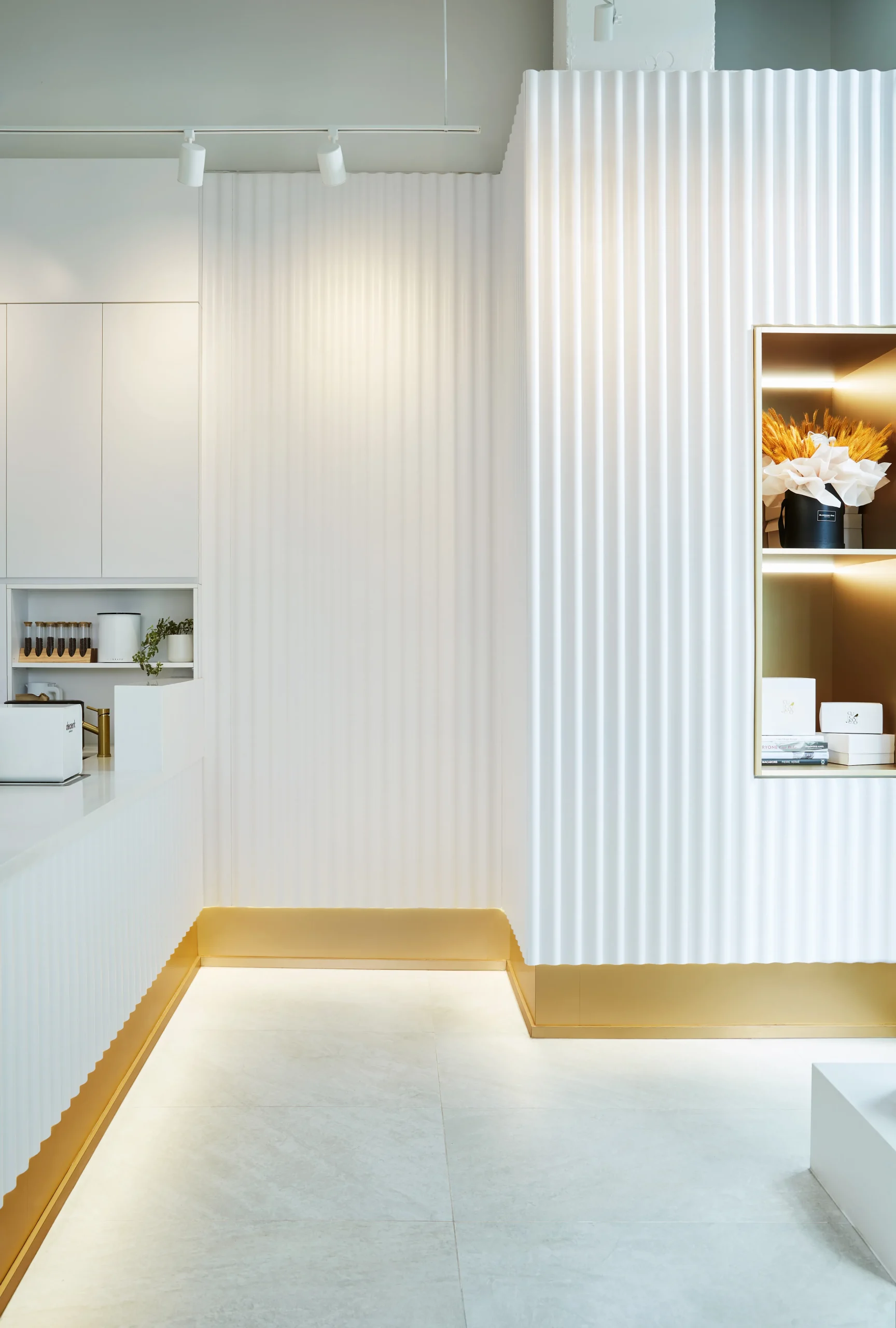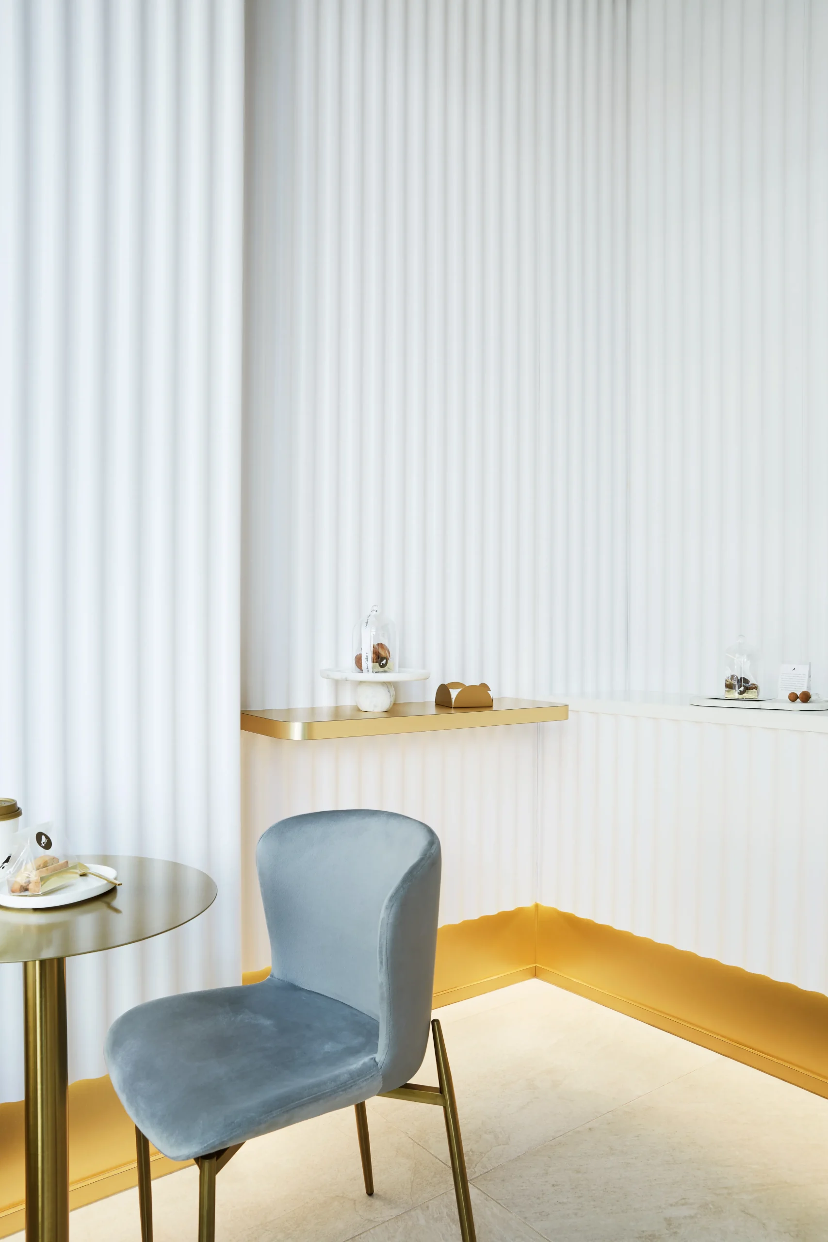 The display counter is characterized by a showstopper white marble wall that’s enlivened with rich veining and, like lively sprinkles, metallic brass finishes throughout offer warm counterpoints to the white palette.