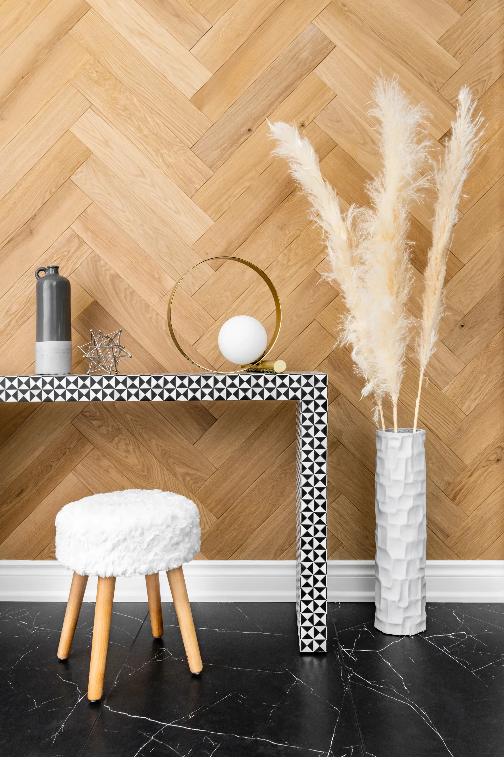 Contrasting elements of patterns, colors, textures and matte-shiny finishes can be found in each room which provides a distinctive personality to the entire house. A simple yet eccentric console table in the foyer sets the mood from the moment you step into the house, akin to an intro in a composition that establishes the groove for the following music.