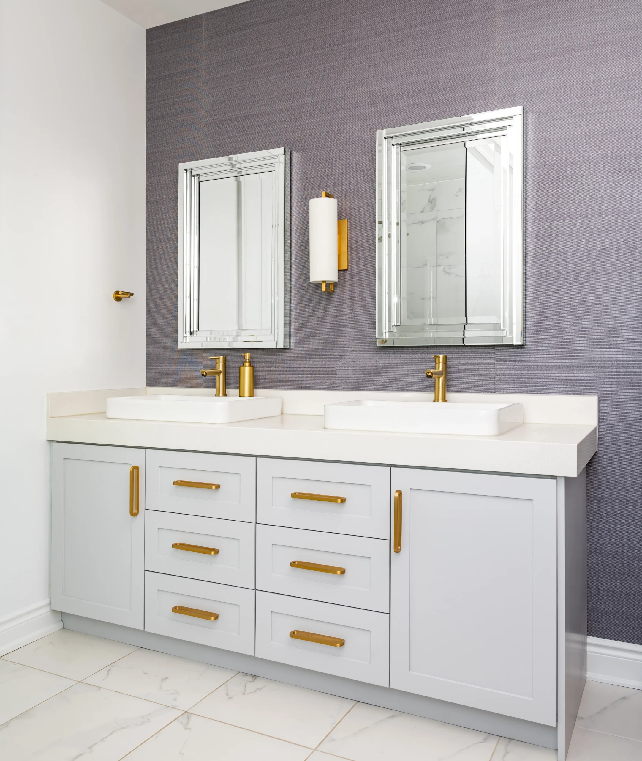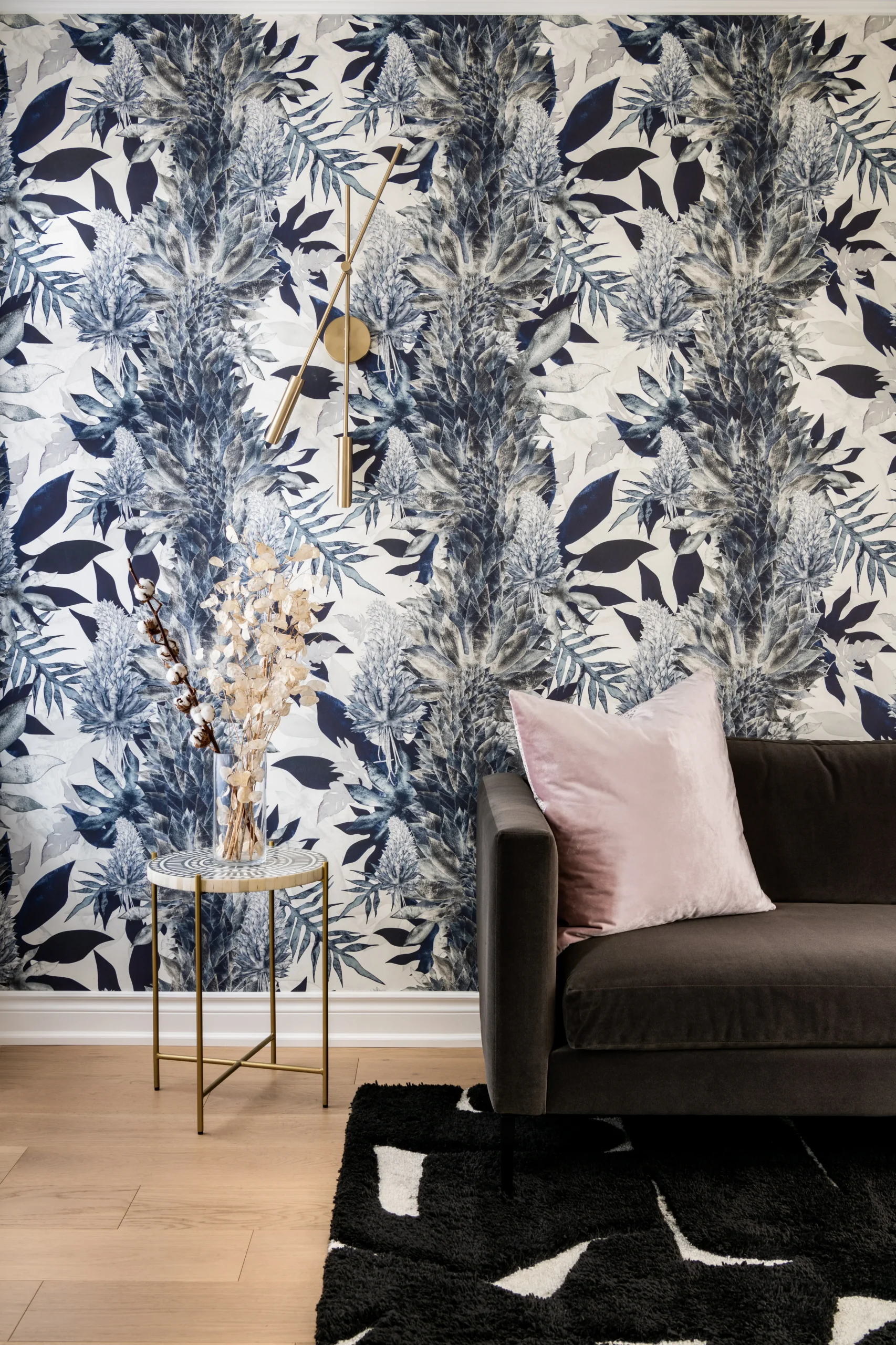 Pale oak wood tones, light grey woodwork and accent brass is a recurring theme throughout. Juxtaposed with intense contrasting materials such as wallcoverings, highly saturated blue cabinetry, and lush velvety textures; these finishes provide the cohesive piece and supplements the design features.