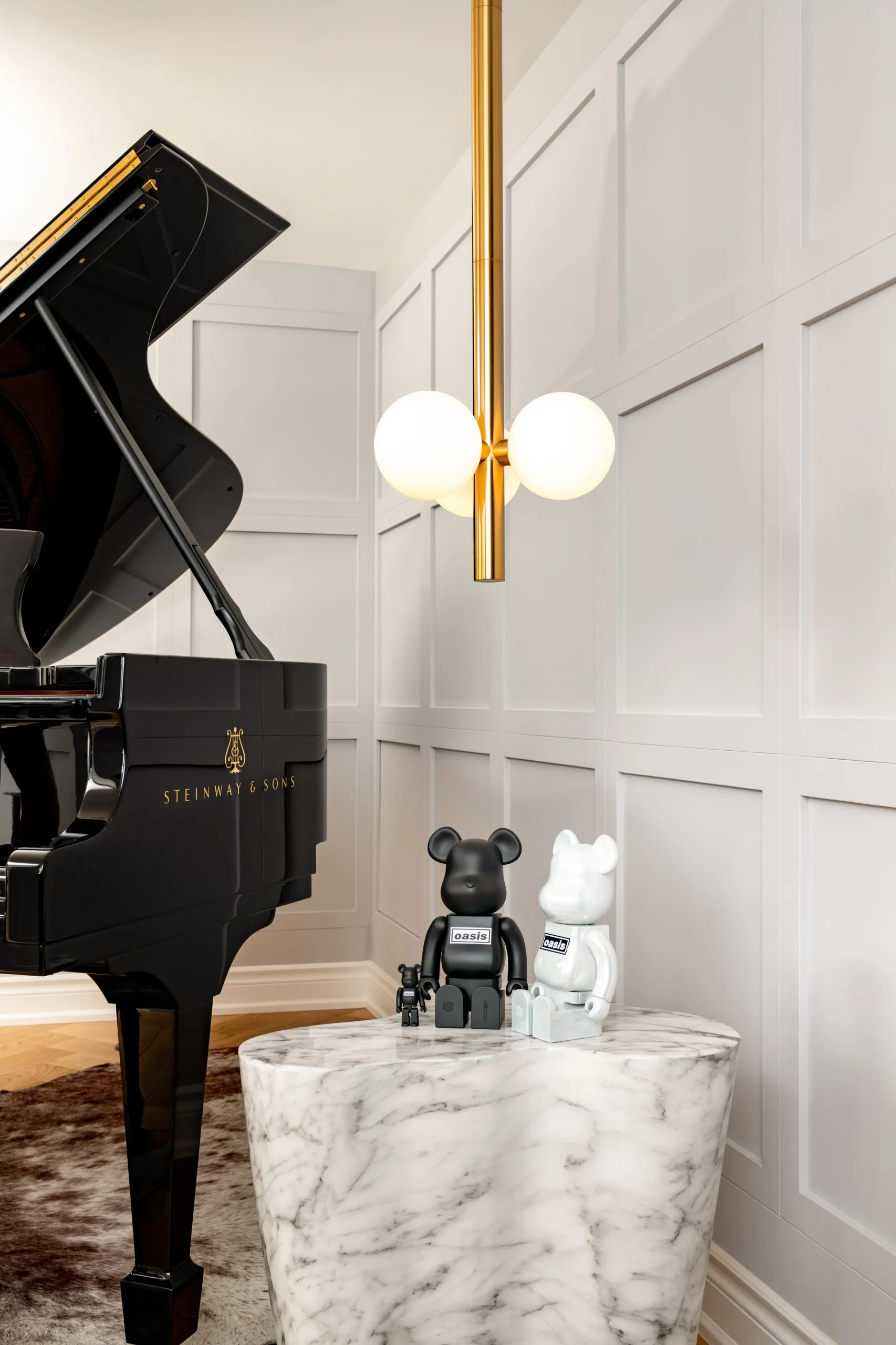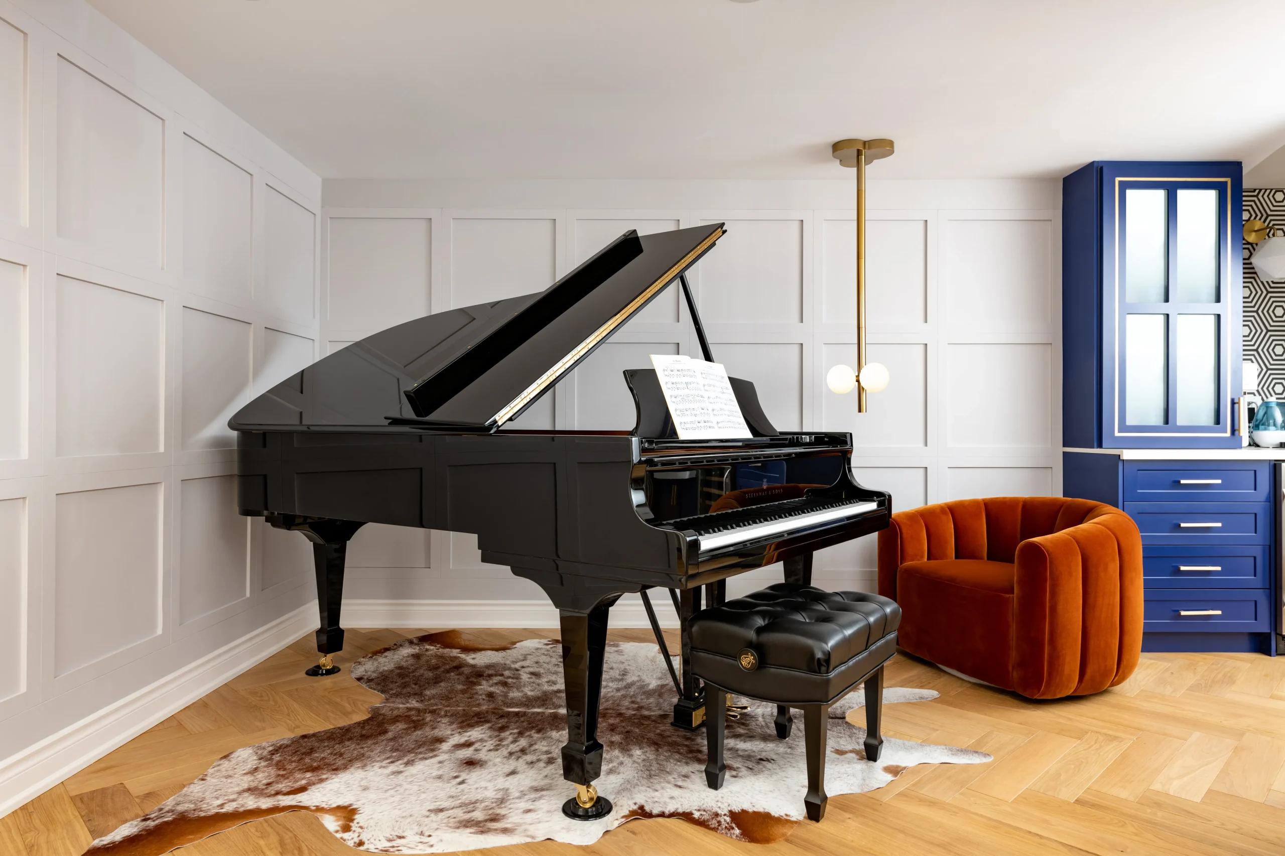 The basement was transformed into a cozy piano room that can also be used as a second living room. The pumpkin color velvet armchair, touches of gold create a jewel-box effect in the piano area.