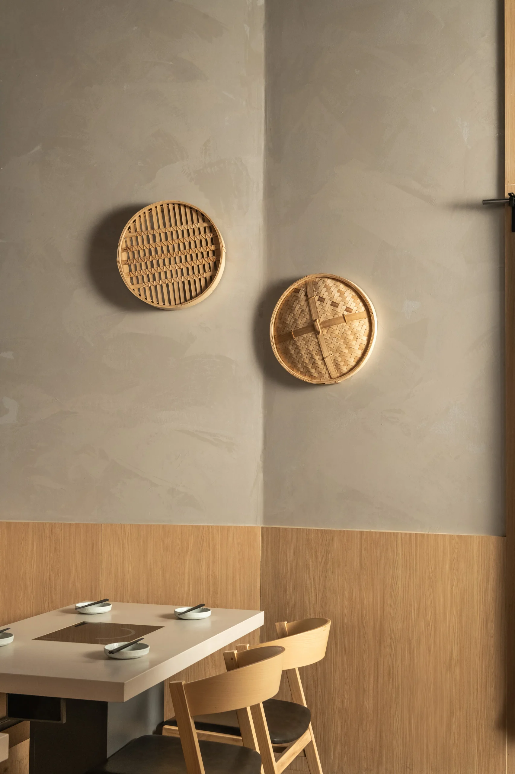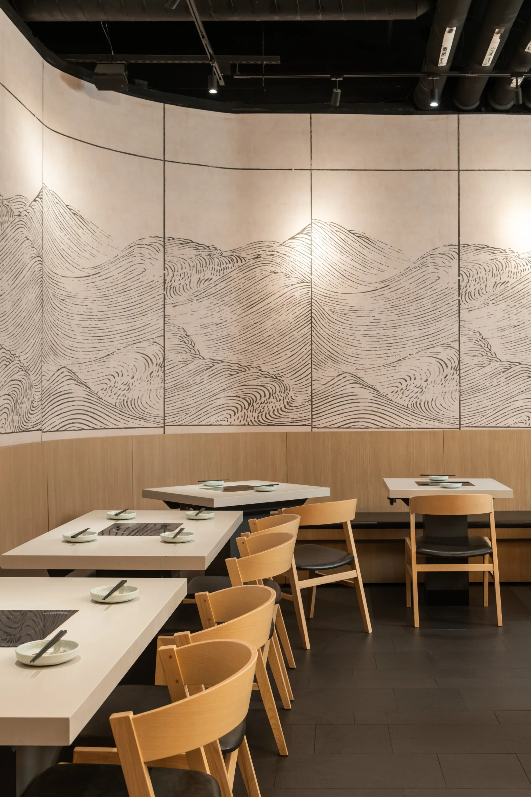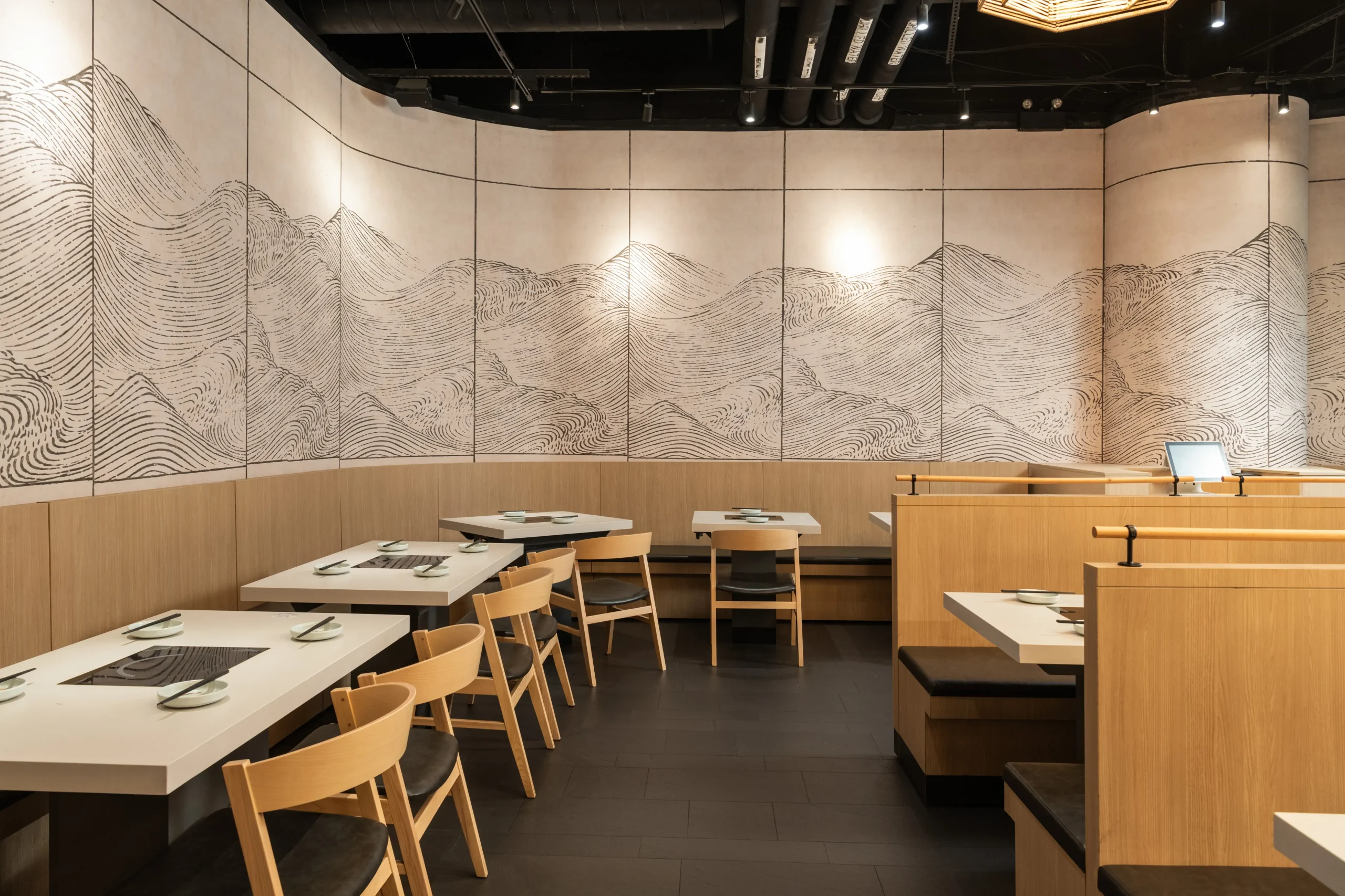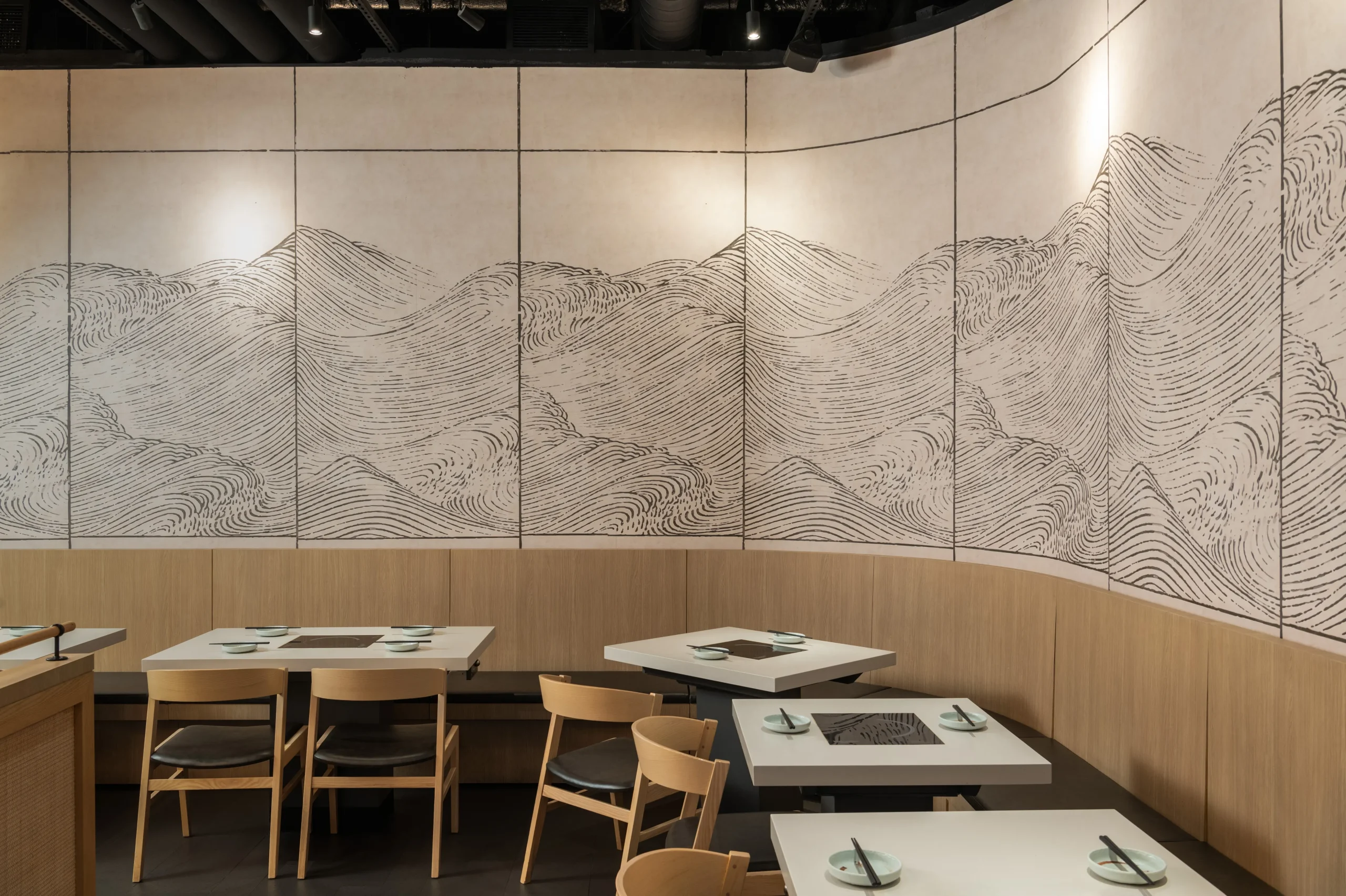 The designs overall palette reflects a harmonious blend of warm neutrals and subtle accents often seen in Japanese interiors. As evident by the customized Japanese ocean wave themed wallcovering that engulfs the main dining area, inspired by Mori Yuzan’s book “Waves and Ripples Ha Bun Shu” the refined imagery coupled with the lines and textures creates a serene atmosphere. This delicate balance of food, materials, textures and scenes makes for a seamless integration of the cuisine and culture.