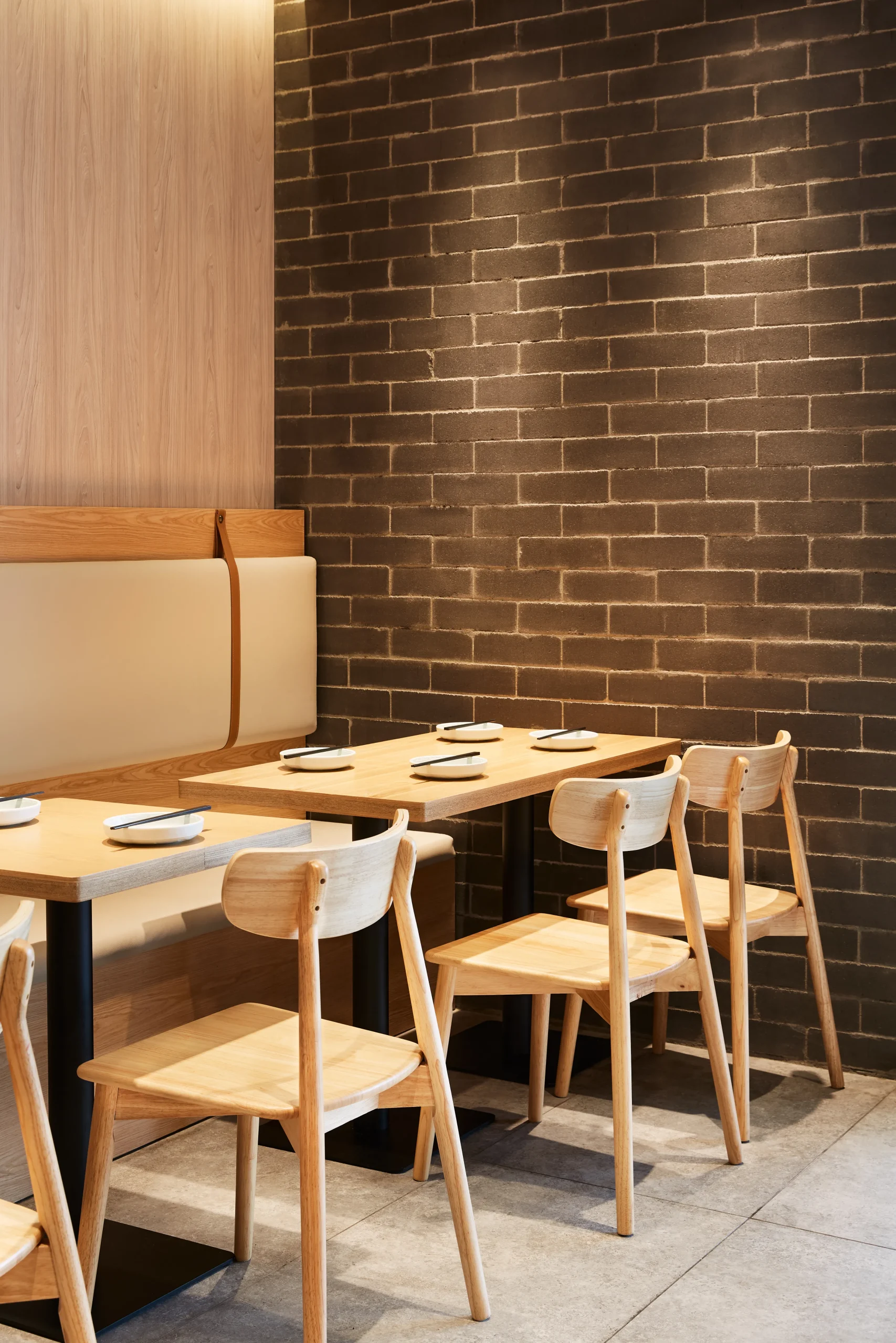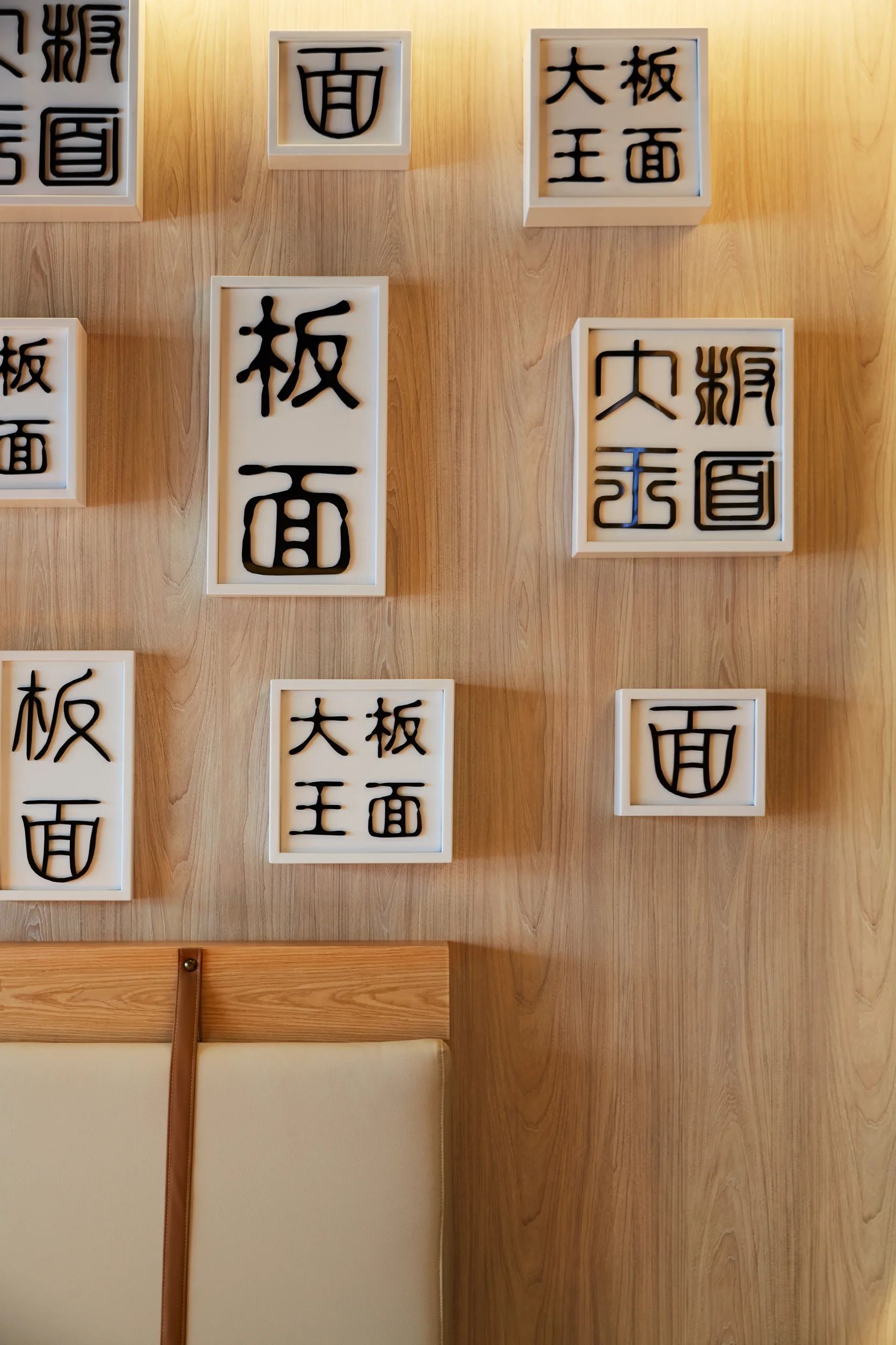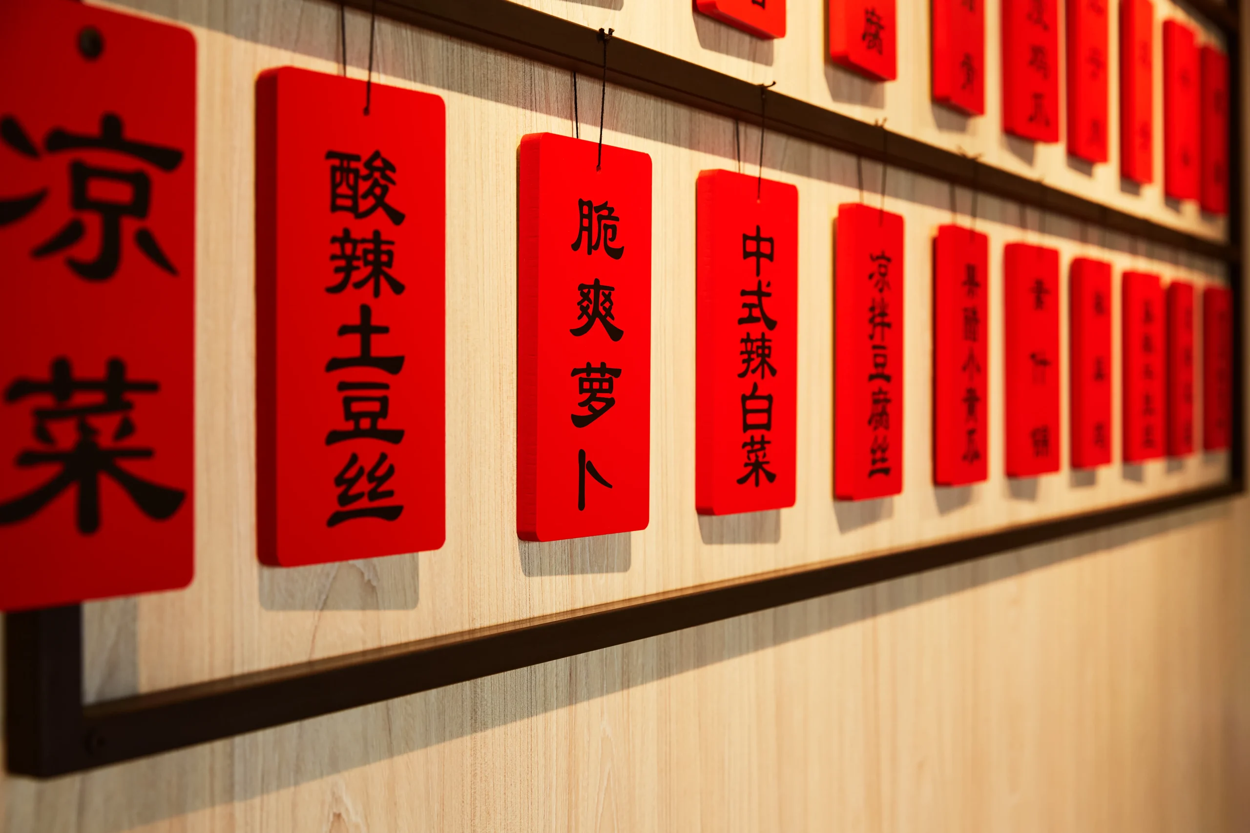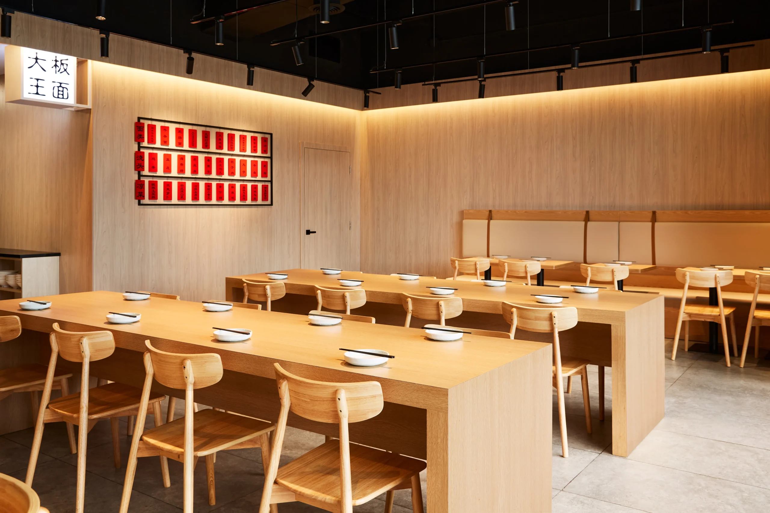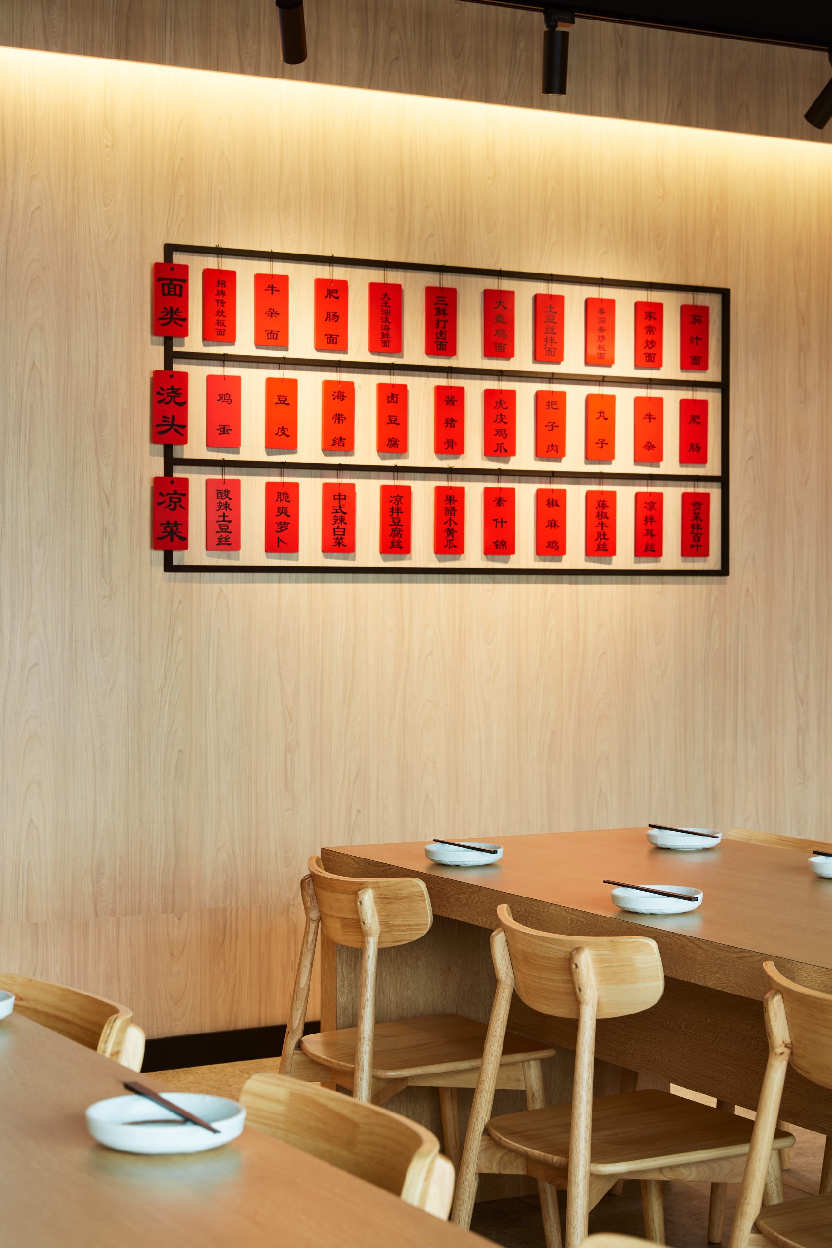 A focal wall, stamped with Chinese characters, spells “Noodle Legend,” while a sign with the texture of rice paper is a nod to classic noodle shops. The counter boasts a burlap sign with graphic characters that translate to, “A Bowl of Homestyle Noodles.” The soothing effect transports guests to the flavours they miss from home.