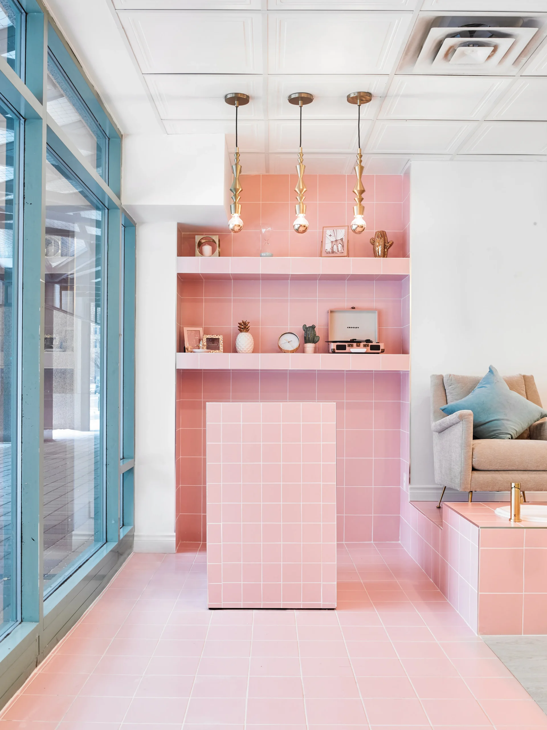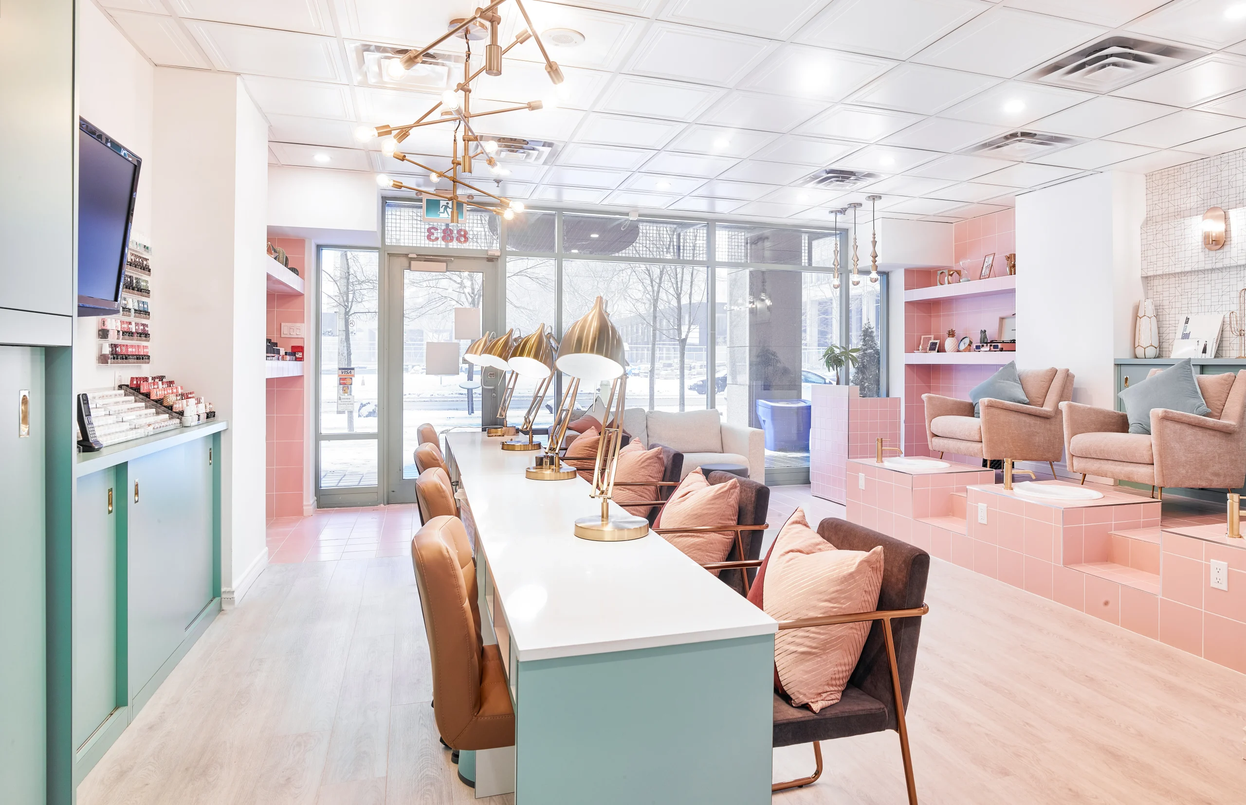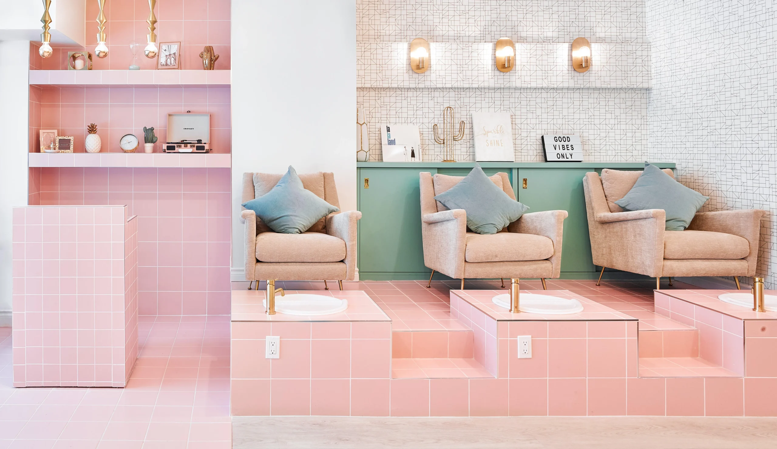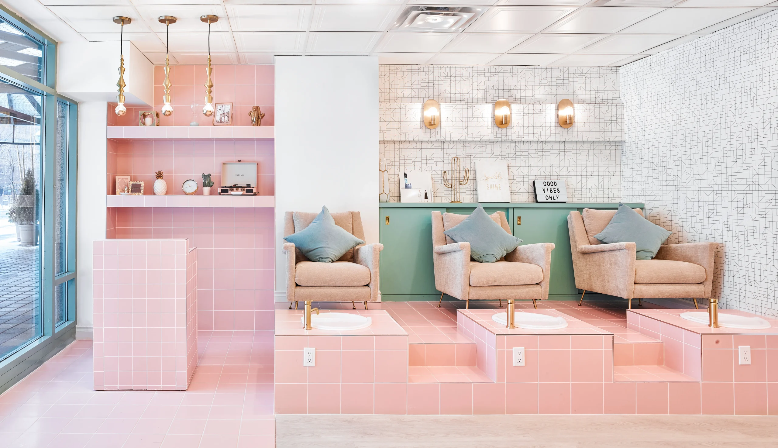 The tiled grid is a guide for the entrance area, the pattern manages to flow consistently at each corner this is illustrated where the wall or counter meets the ground. “We worked the interior space around its branding colours and paired it with copper finishes to create a warm, cozy environment for a fully modern look” This geometric wall covering also extends the concept of cubes and lines into the pedicure area.